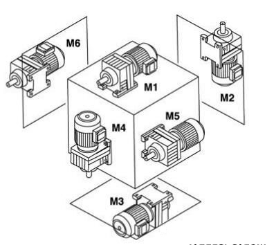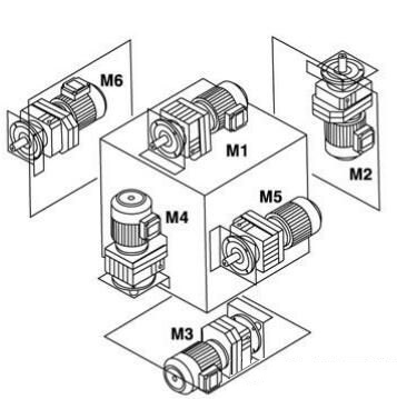 M6-電機(jī)水平放置;當(dāng)減速機(jī)在M1安裝位置時(shí),從電機(jī)方向看,減速機(jī)的左面旋轉(zhuǎn)到上方位置。